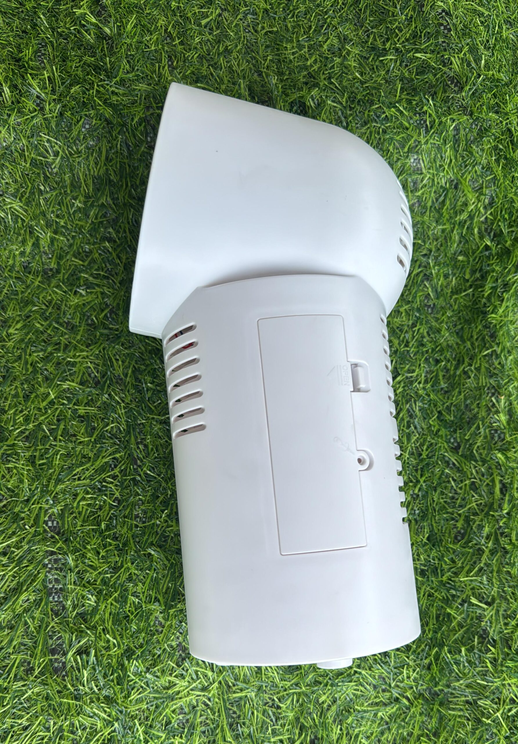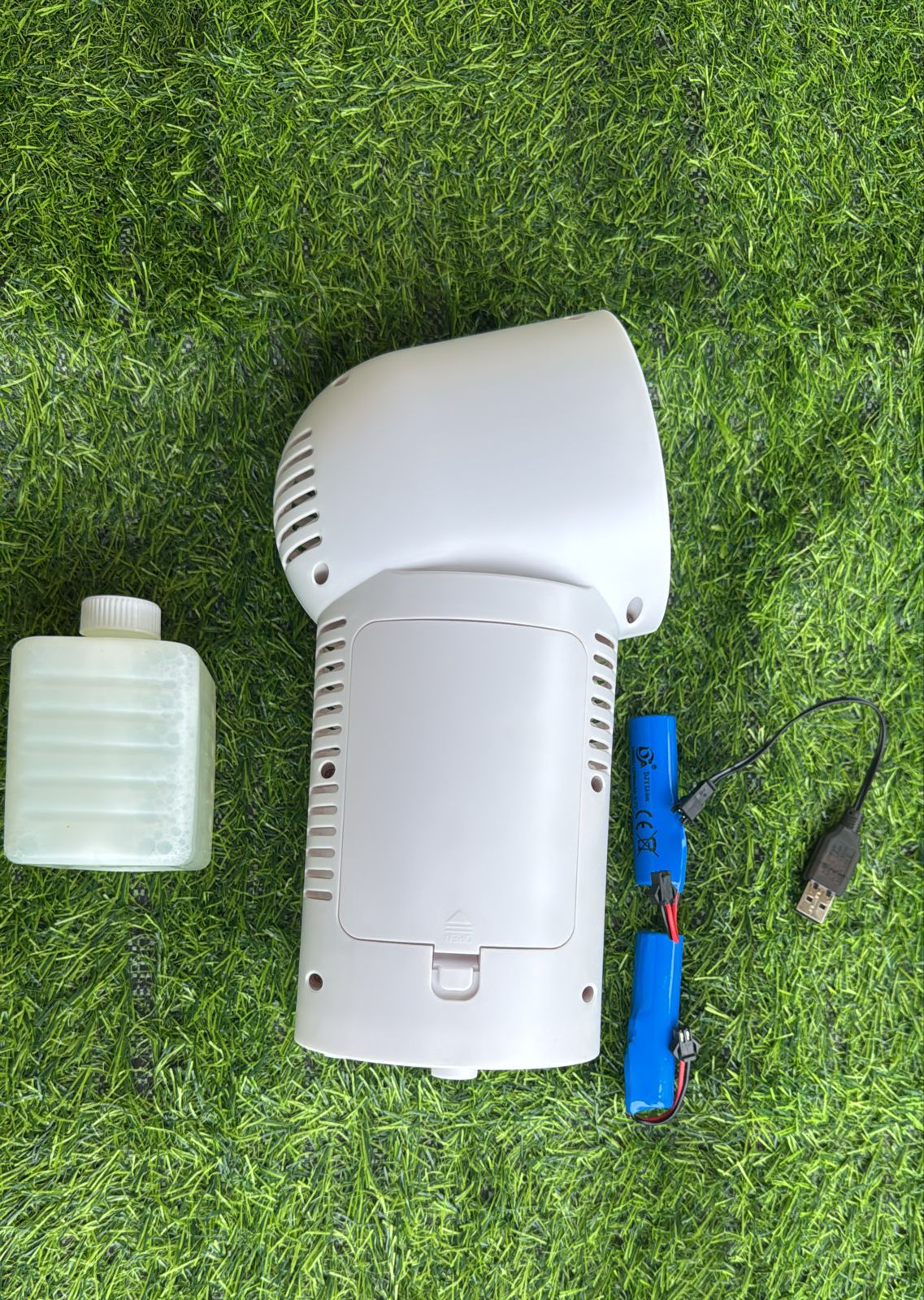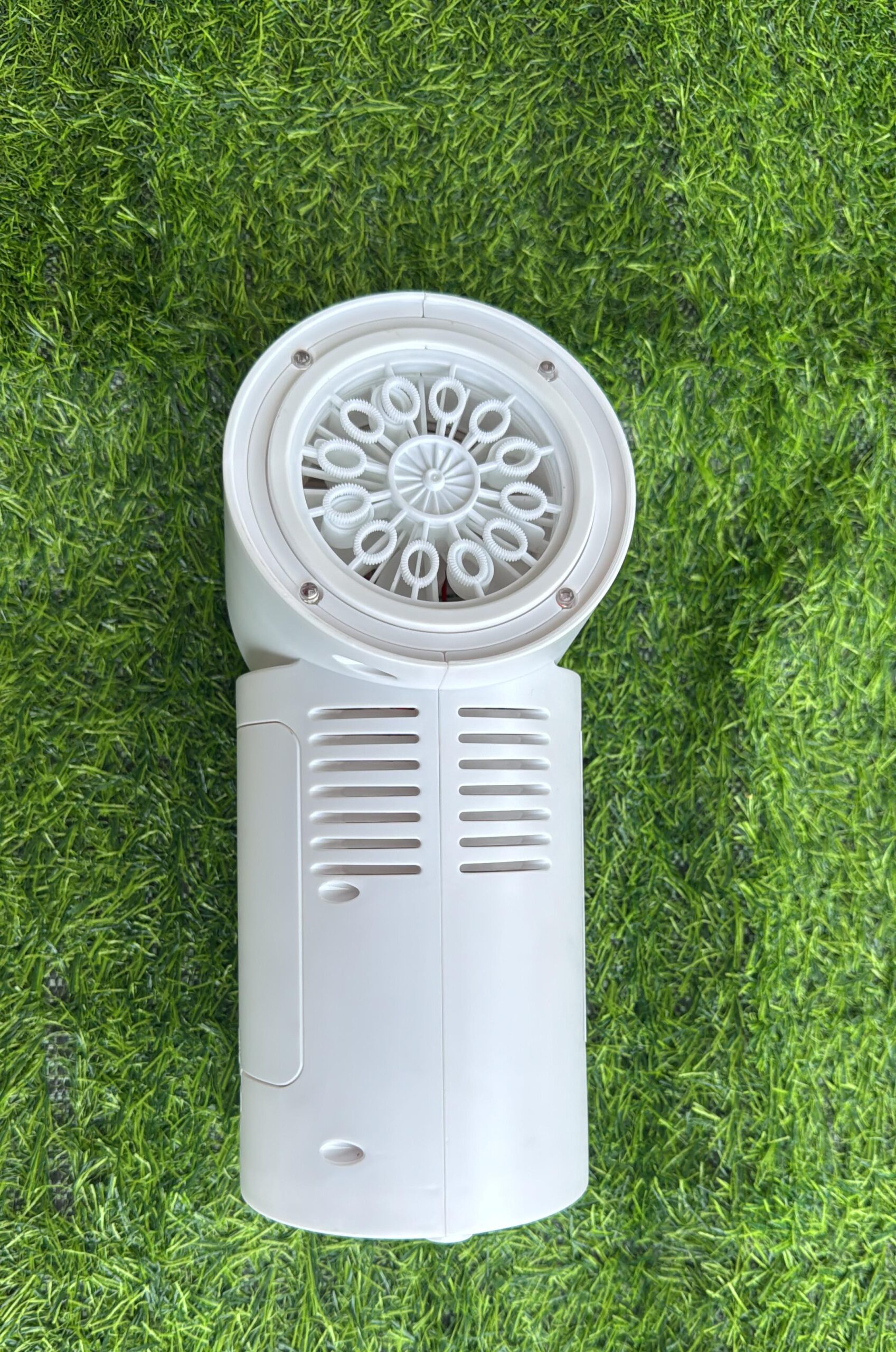 Maquina de burbujas giratoria 180° funciona con batería recargable trae pequeñas luces a su alrededor. Material plástico