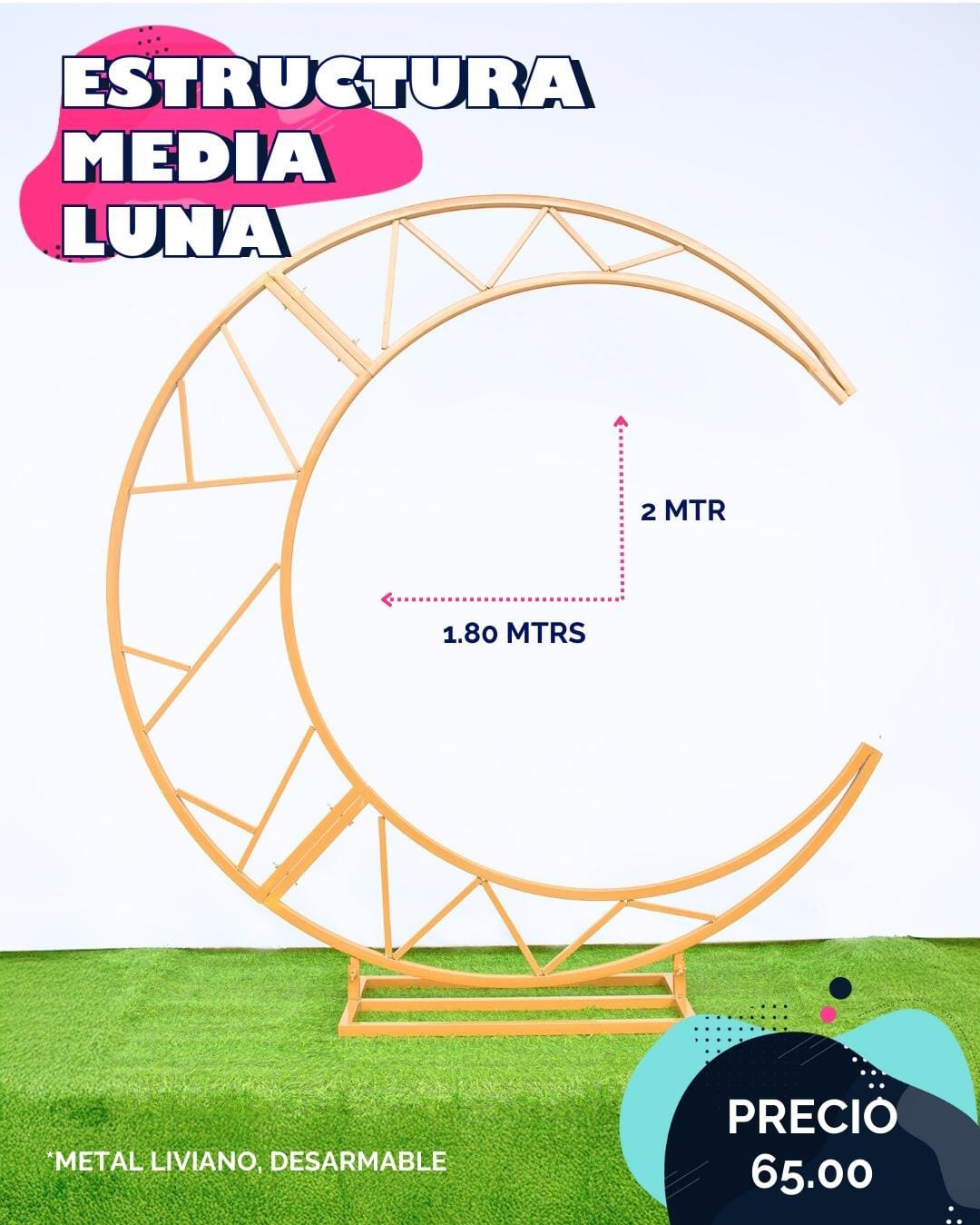 Media luna desarmable en 3 parte , mide 2 metros de alto y de ancho 1.80 metros, es de metal , facil de transportar, ideal pàra Baby shower, Bodas , 15 años , entre otros eventos …..