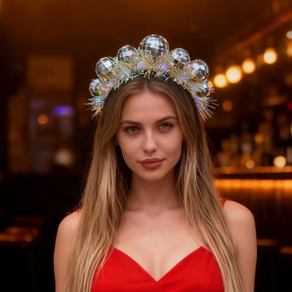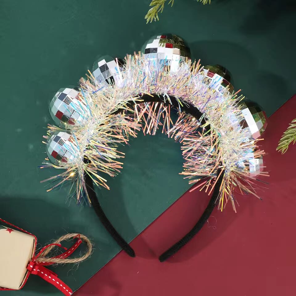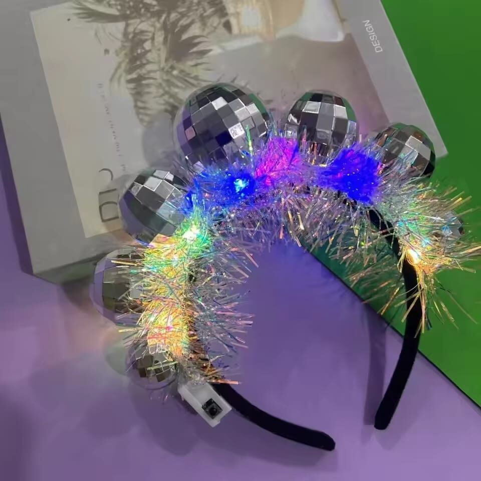 Vincha con diseños de bolas de disco con luces, cuenta con botón de encendido y apagado.